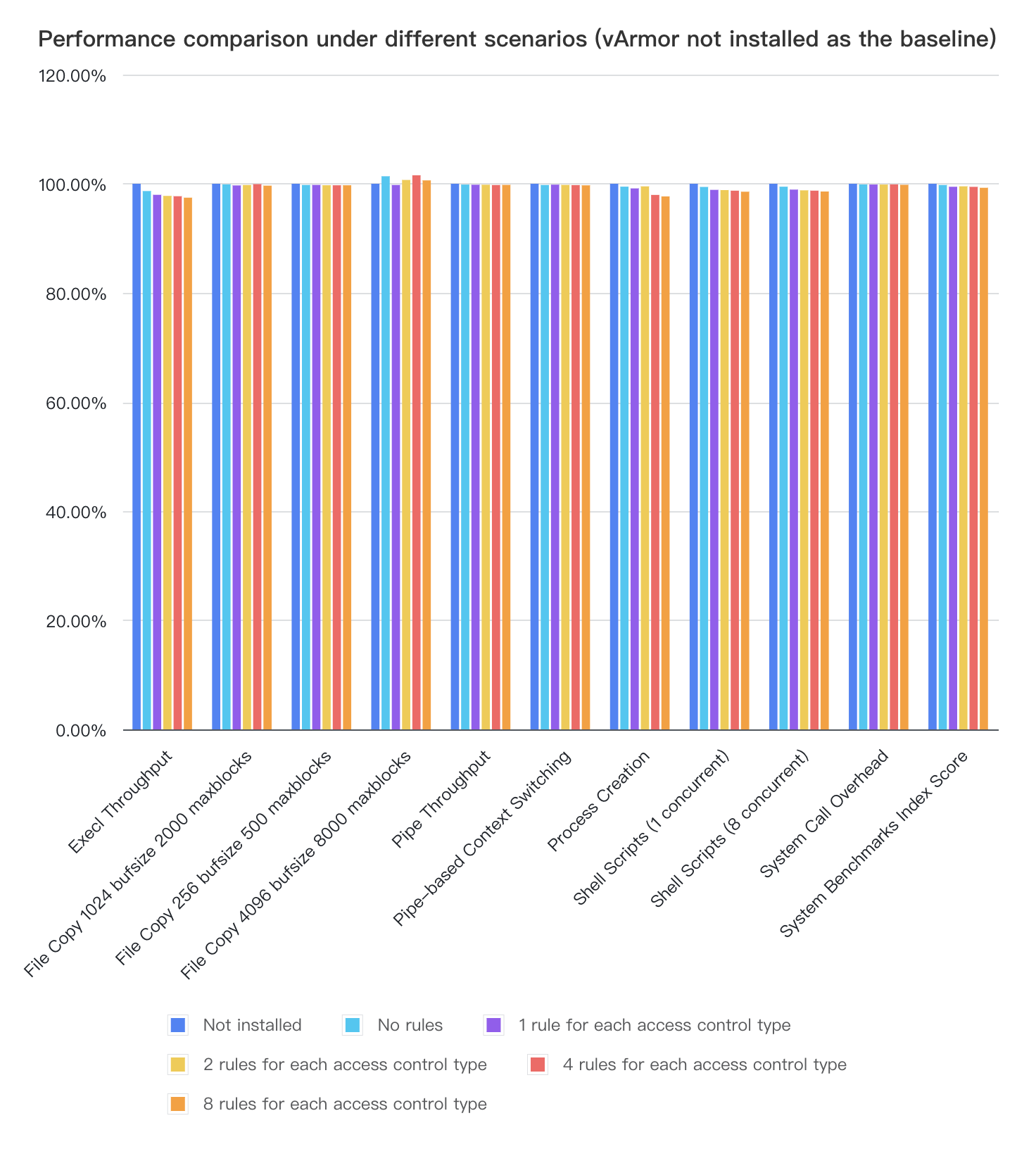 - vArmor v0.5.0 在 Execl Throughput 和 Process Creation 中引入的性能损耗最大,当为容器进程设置各类型策略 8 条规则后,其 execl 的最大性能损耗为 2.55%,进程创建的最大性能损耗为 2.32%。